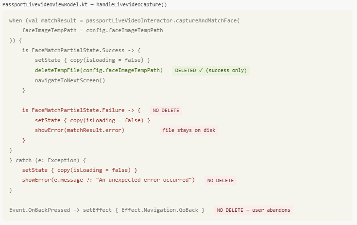 For NFC biometric data: It pulls DG2 and writes a lossless PNG to the filesystem. It’s only deleted on success. If it fails for any reason (user clicks back, scan fails & retries, app crashes etc), the full biometric image remains on the device in cache. This is protected with CE keys at the Android level, but the app makes no attempt to encrypt/protect them.