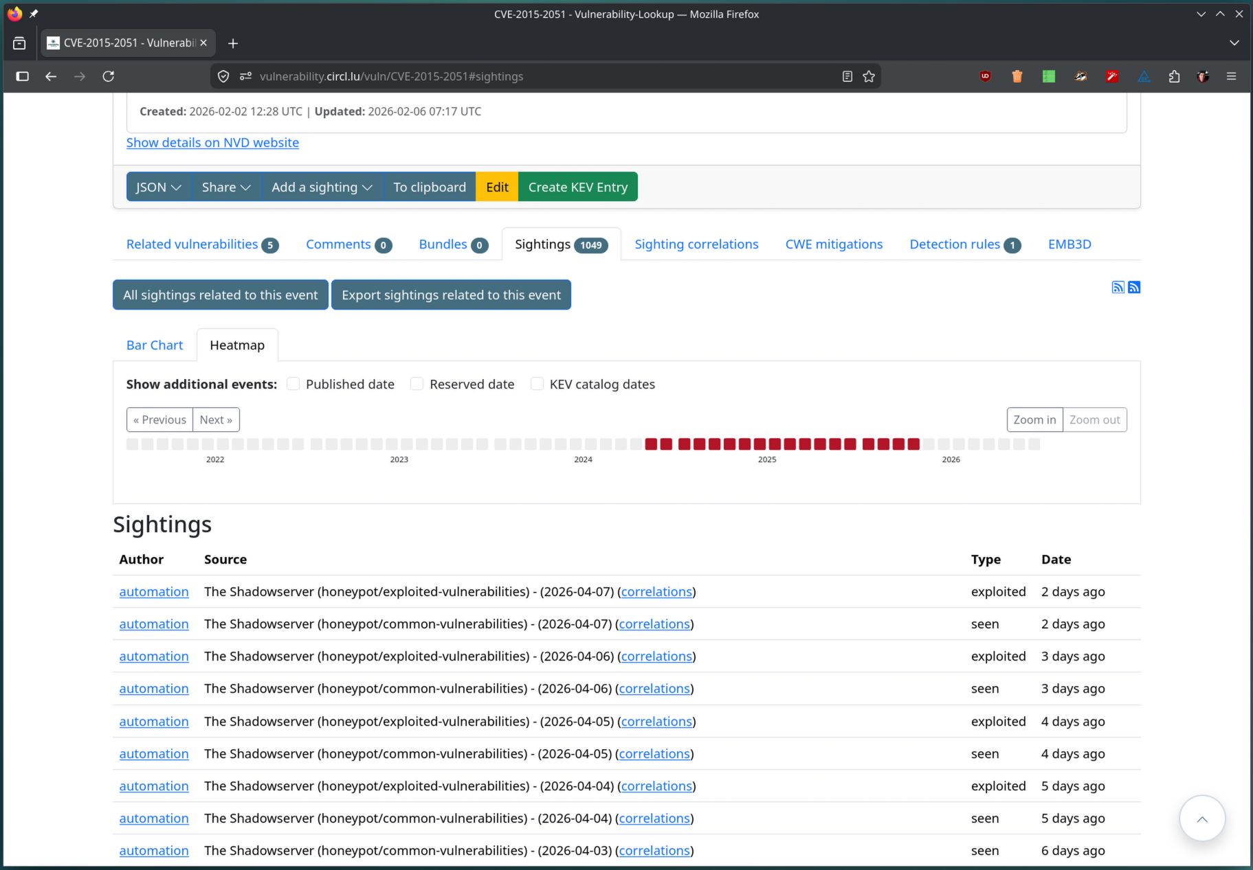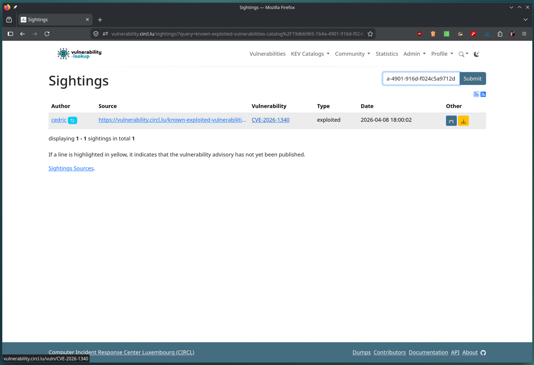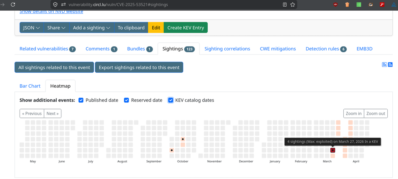 Creating a KEV entry β whether directly, via synchronisation from another Vulnerability-Lookup instance, or by pulling from the CISA or ENISA catalogs β now automatically generates a sighting.