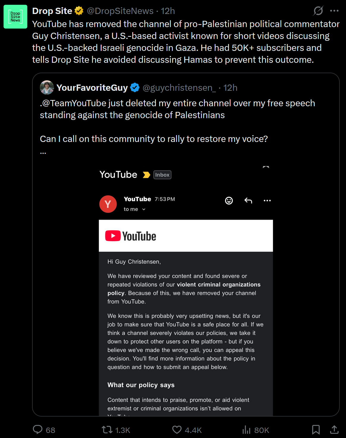 Youtube bans pro-Palestine creator Guy Christensen shortly after his Instagram ban and TikTok demonitization