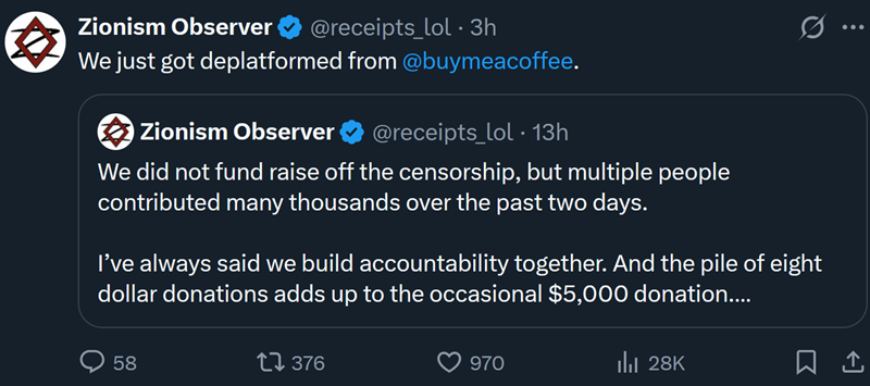 BuyMeACoffee deplatforms Zionism Observer